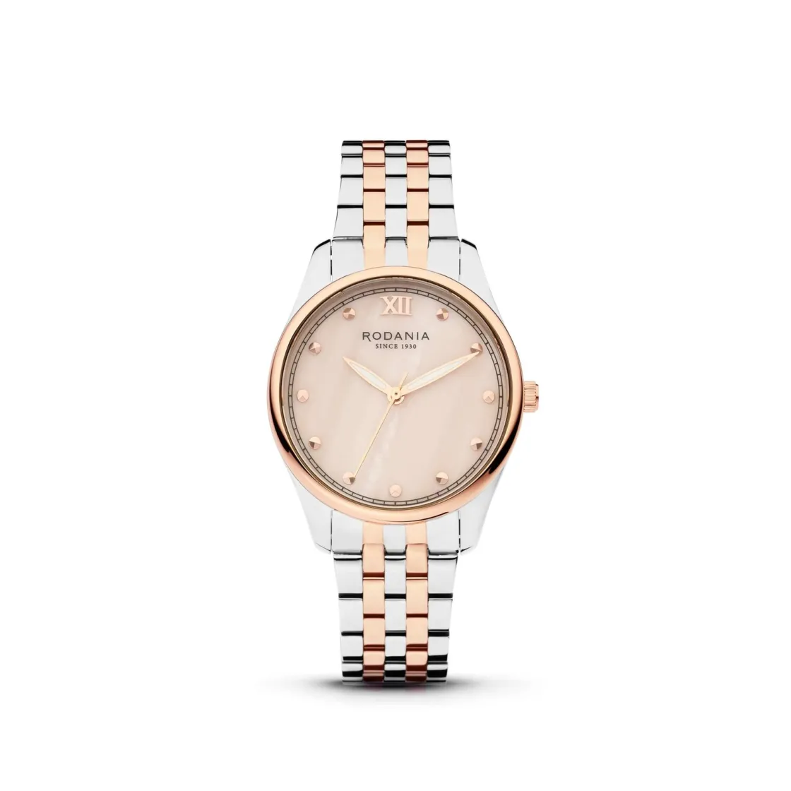 Montre de la collection Gstaad, mouvement suisse, quartz 3 aiguilles, cadran nacre rose, boitier acier bicolore sur bracelet acier bicolore avec boucle déployante.