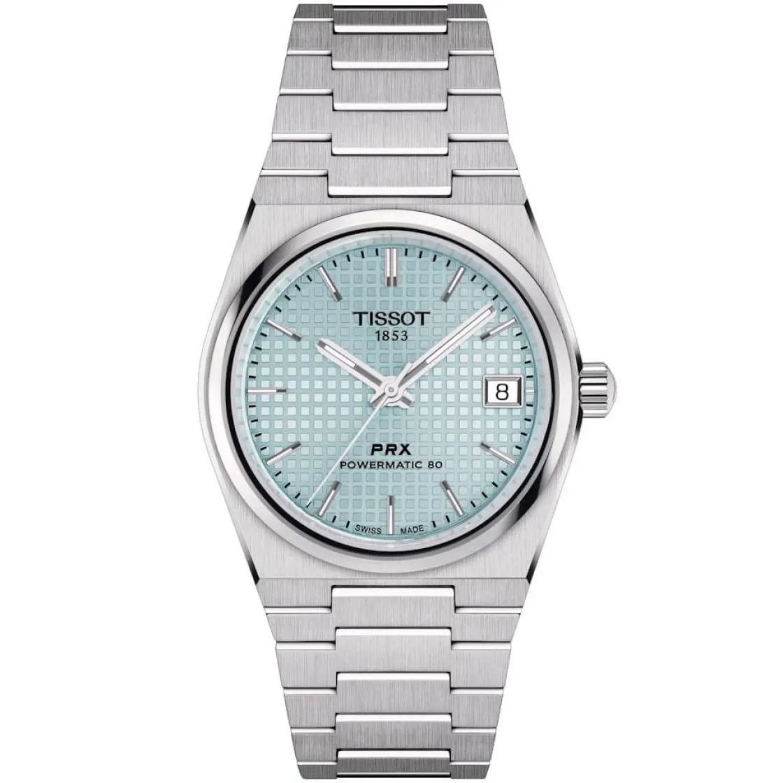 Montre de la collection PRX, mouvement suisse 3 aiguilles powermatic 80, dateur à 3h, verre saphir inrayable, cadran bleu glacier, boitier acier sur bracelet acier avec boucle déployante.