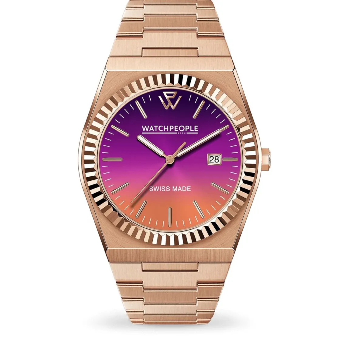 Montre de la collection WP1, mouvement quartz suisse 3 aiguilles, dateur à 3h, verre saphir, cadran multicolore, boitier acier doré rosé sur bracelet acier doré rosé avec boucle déployante.