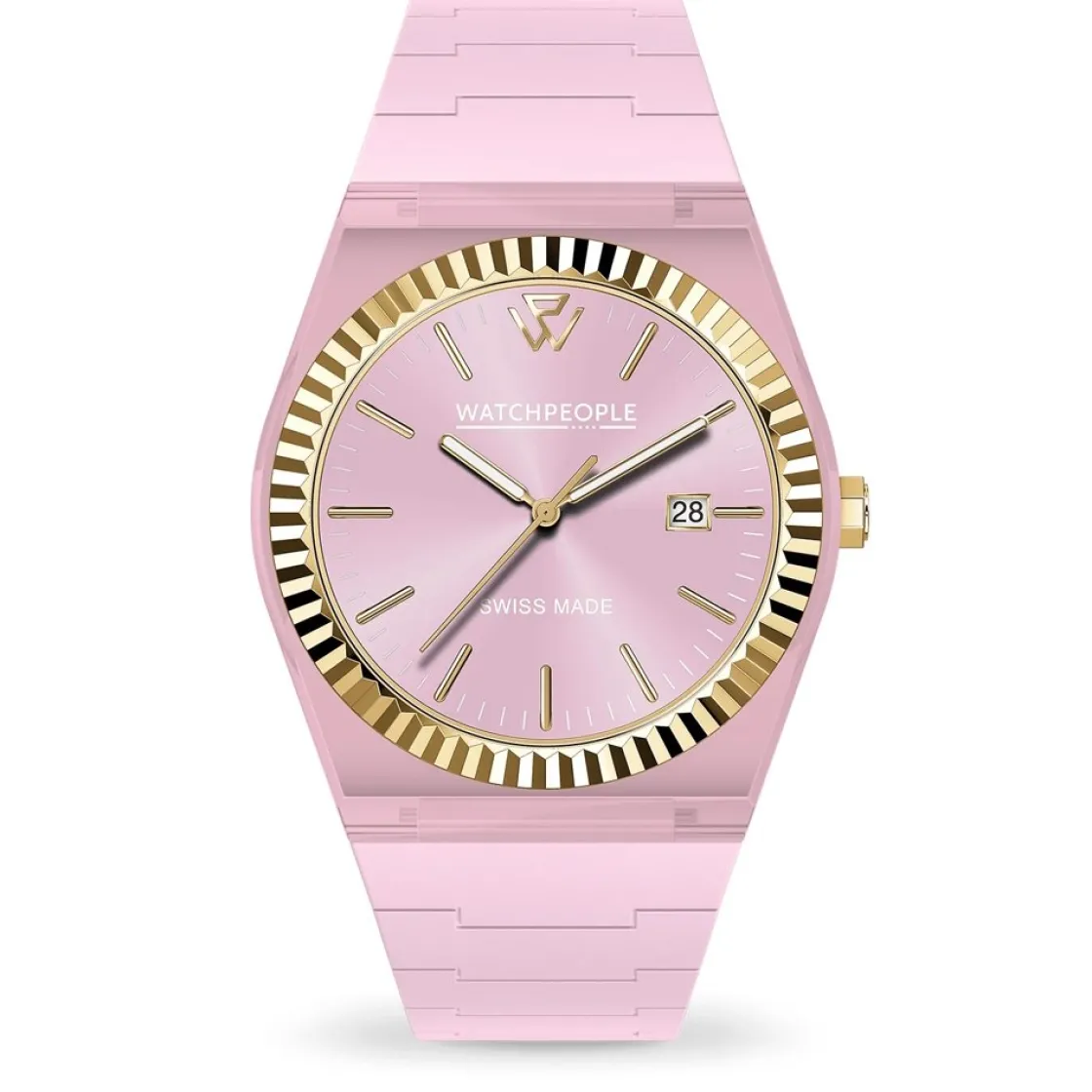 Montre de la collection WP1, mouvement quartz suisse 3 aiguilles, dateur à 3h, verre saphir, cadran rose, boitier plastique rose sur bracelet silicone rose.