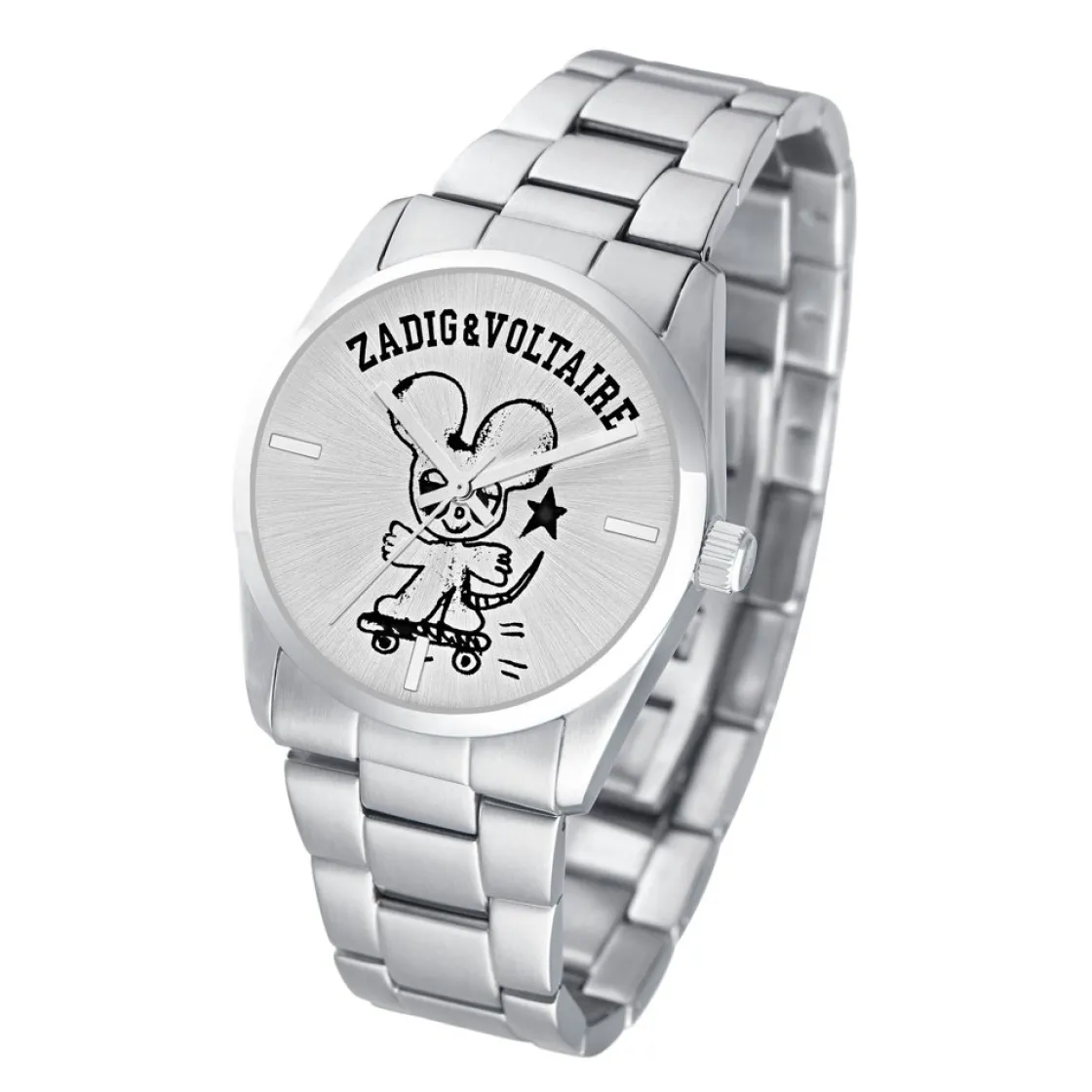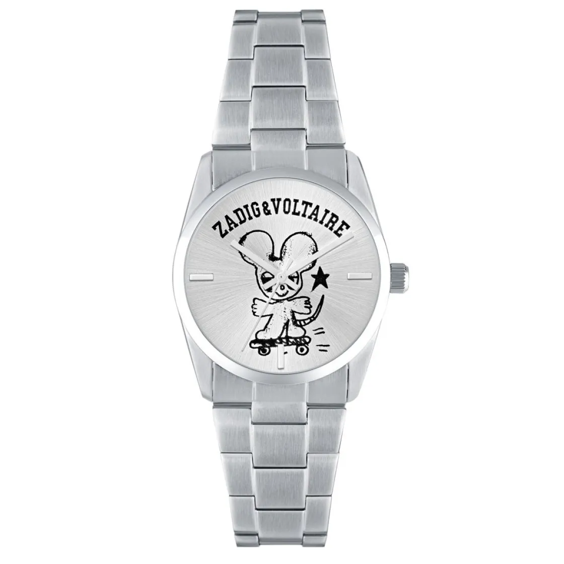 Montre Zadig et Voltaire, mouvement quartz 3 aiguilles, cadran argenté, boitier acier sur bracelet acier avec boucle déployante.