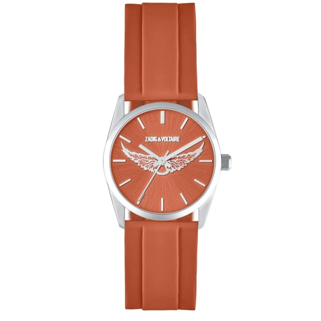 Montre Zadig et Voltaire, mouvement quartz 3 aiguilles, cadran brun, boitier acier sur bracelet silicone brun.