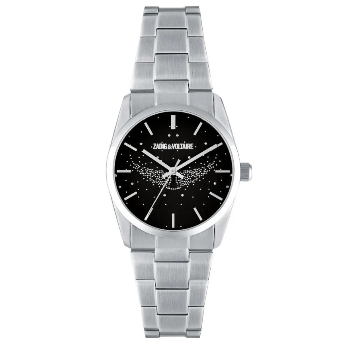 Montre Zadig et Voltaire, mouvement quartz 3 aiguilles, cadran noir, boitier acier sur bracelet acier avec boucle déployante.