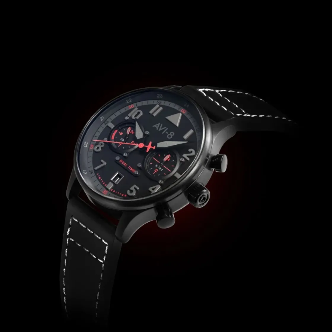 Montre de la collection Hawker Hurricane, mouvement quartz dual time, dateur à 6h, cadran noir , boitier acier noir sur bracelet cuir noir.
