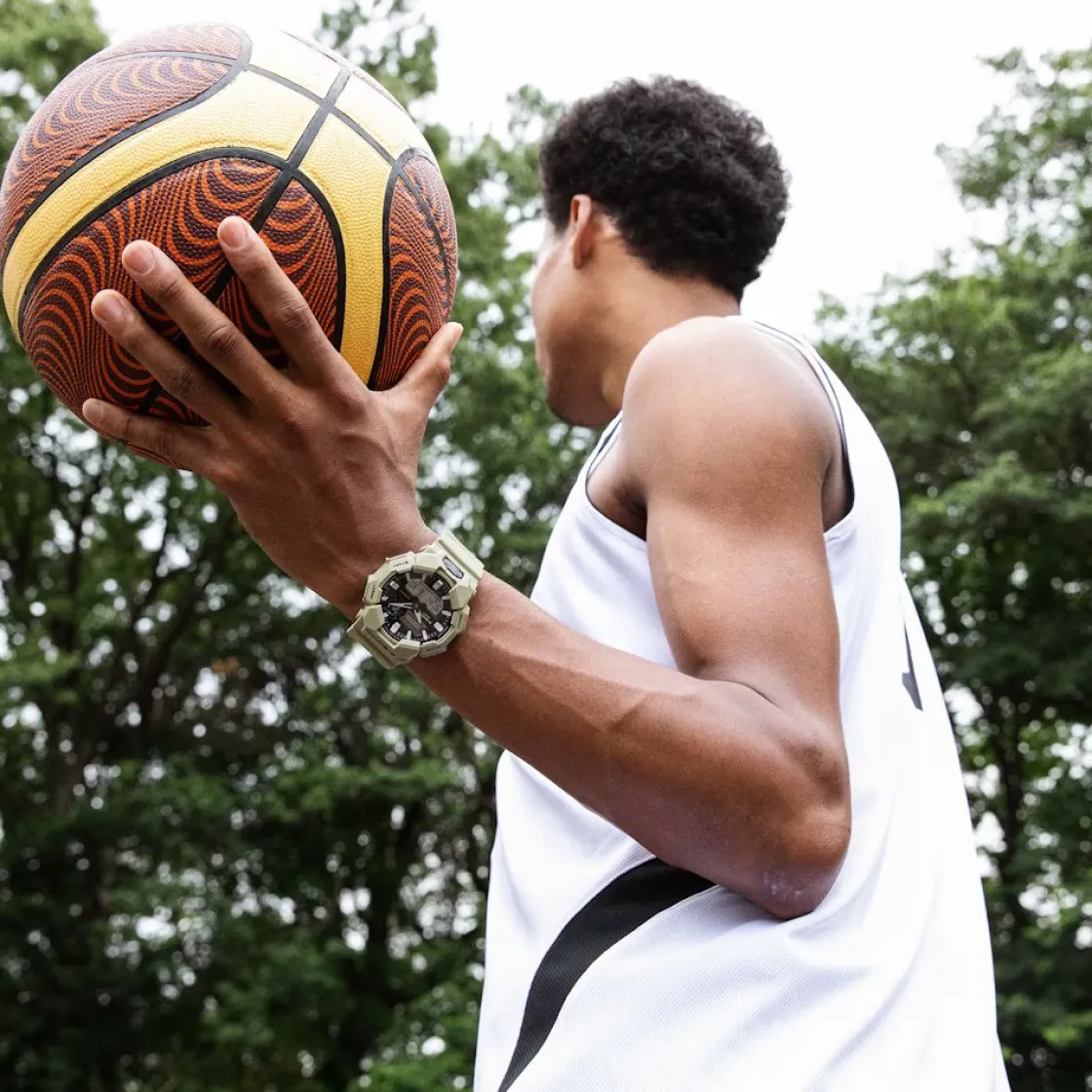 Montre de la collection G-Shock, mouvement à quartz 2 aiguilles analogique et digital, cadran noir, boitier en carbone/résine beige sur bracelet résine beige.