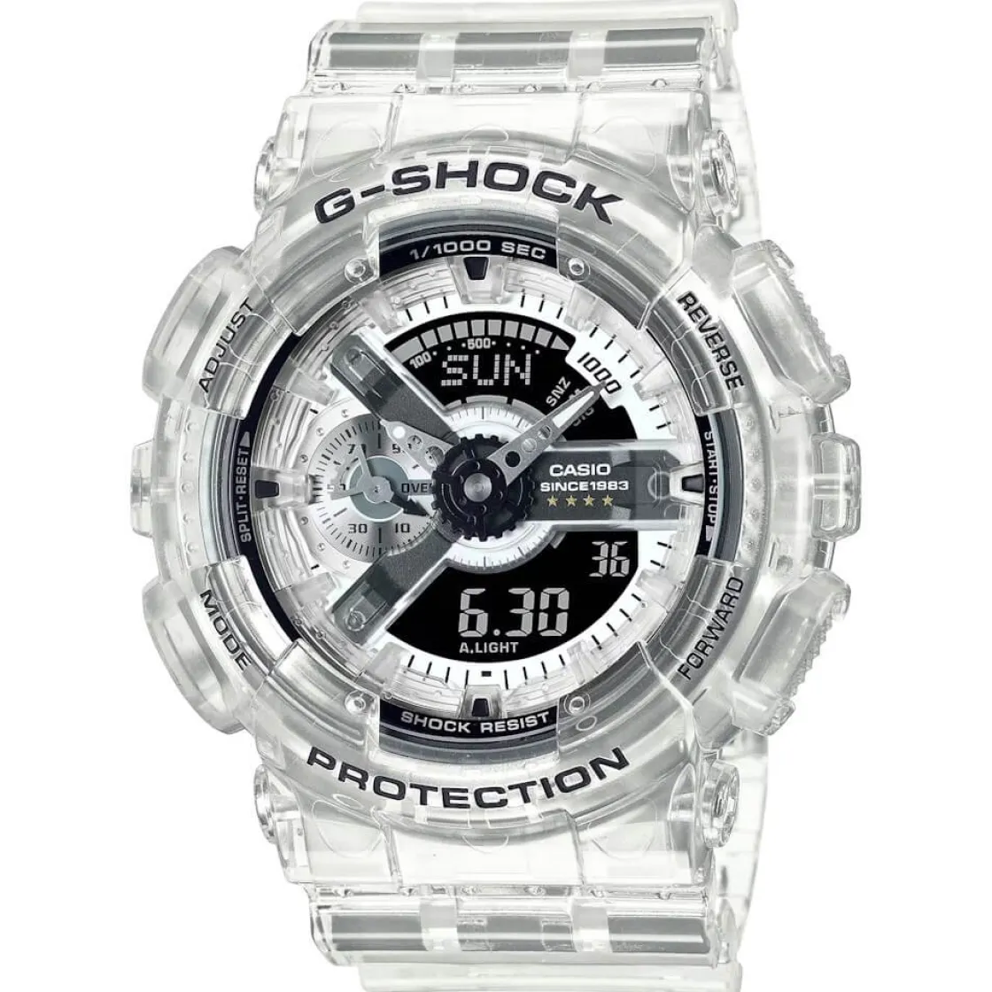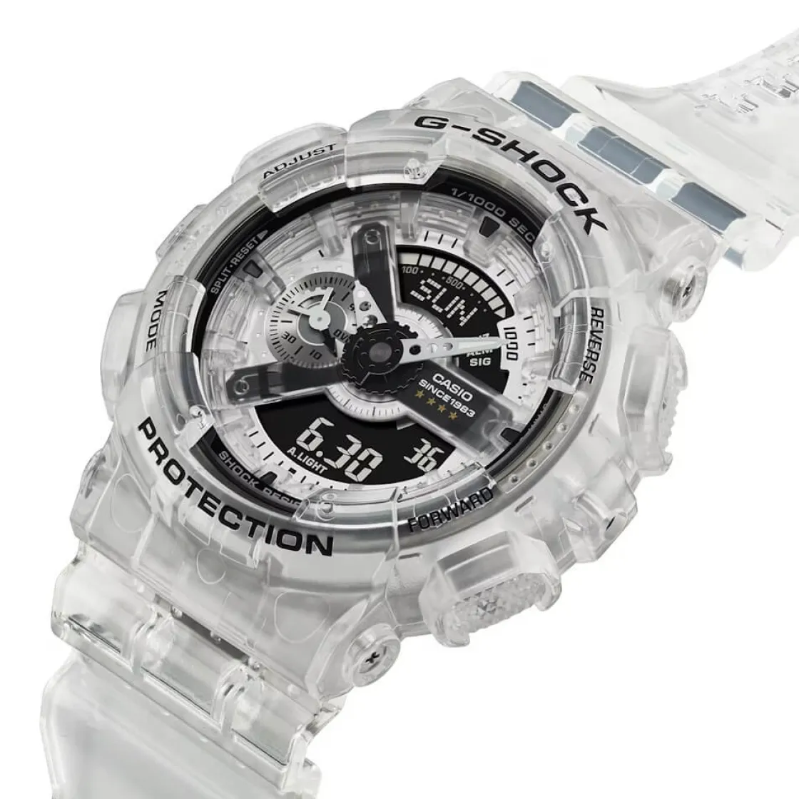 Montre de la collection G-Shock, mouvement à quartz 2 aiguilles analogique et digital, cadran blanc et noir , boitier en résine transparent sur bracelet résine transparent.