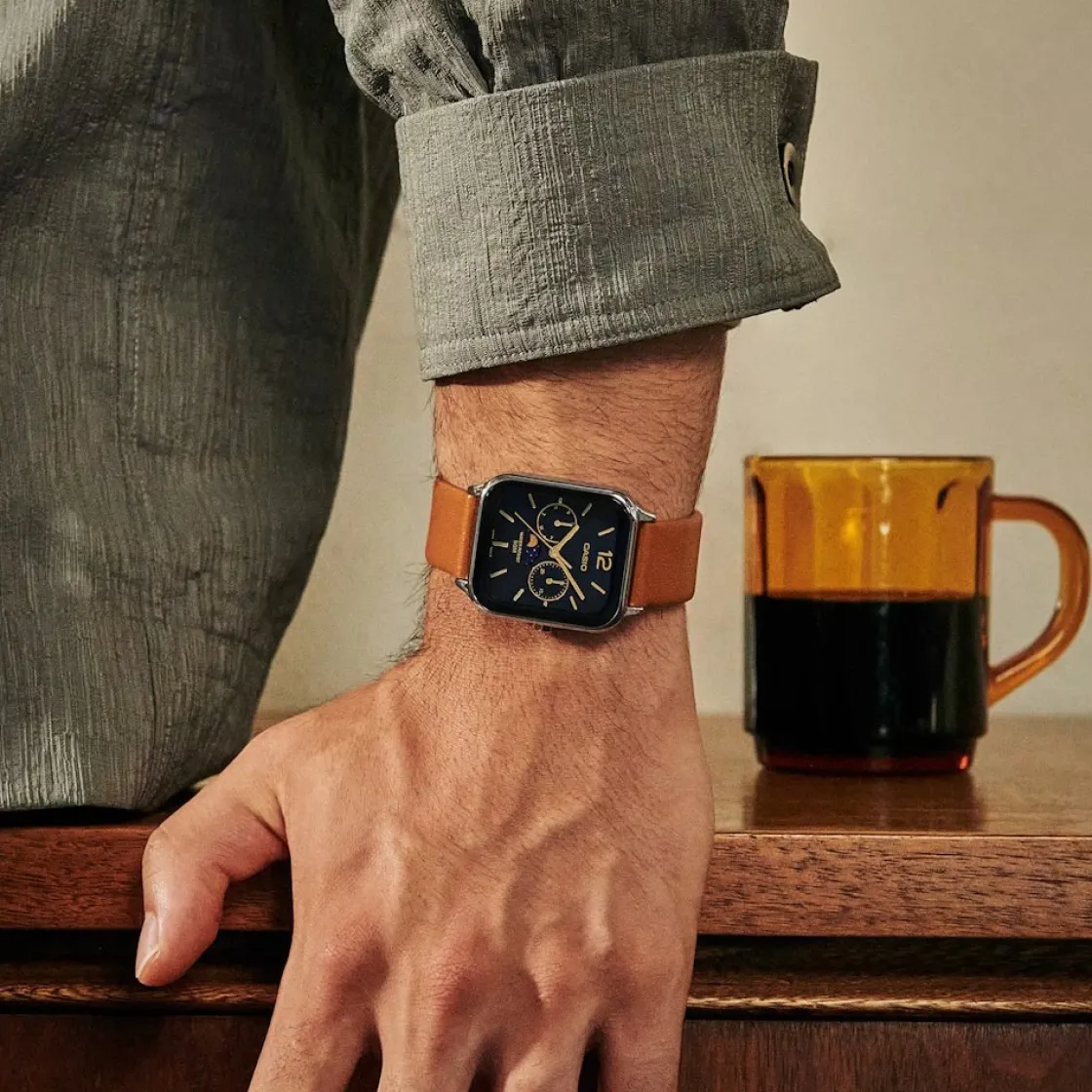 Montre de la collection Casio, mouvement quartz multifonctions , phases lunaires ,cadran noir, boitier acier sur bracelet cuir marron.