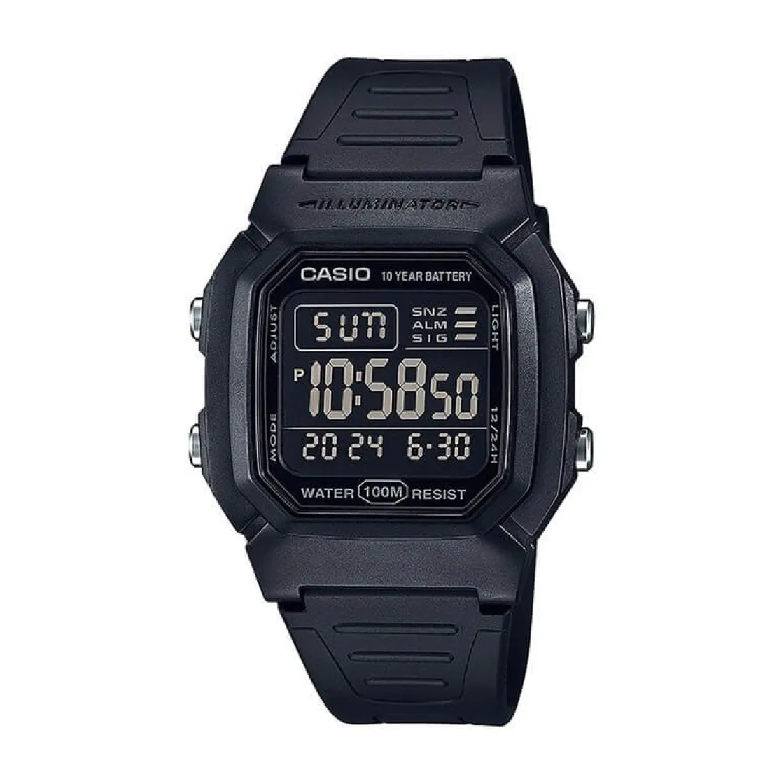 Montre à mouvement quartz digital (chrono,alarme), boitier en résine noir avec un cadran noir sur bracelet résine noir.