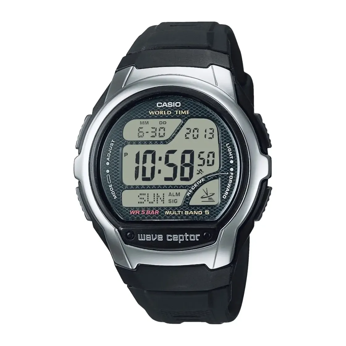 Montre de la collection Wave Ceptor, mouvement digital radio-controllé à quartz, boitier en plastique noir sur bracel…