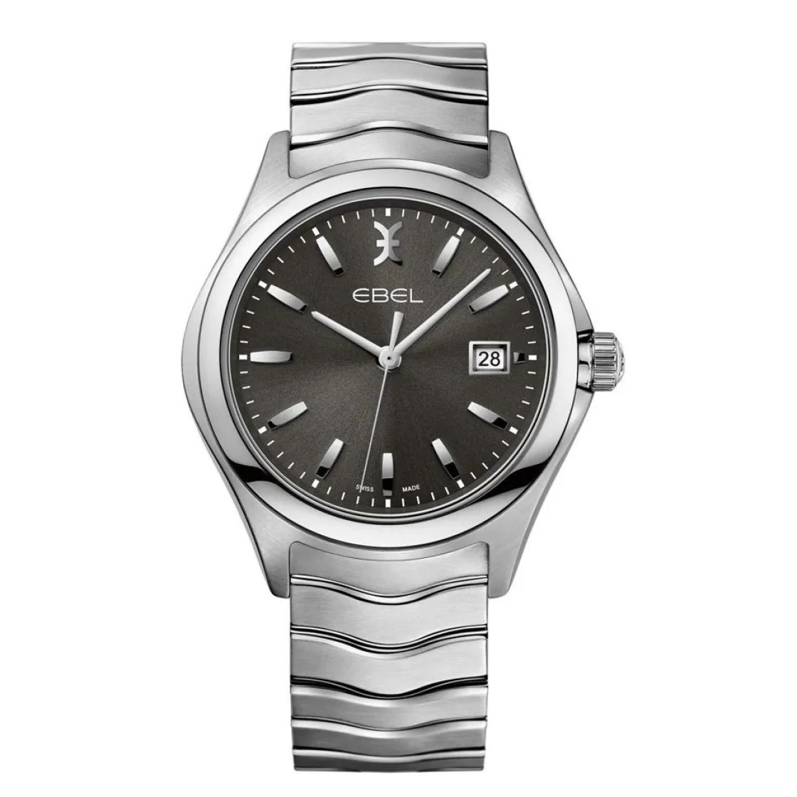 Montre de la collection Vague, boîtier en acier inoxydable brossé et poli, cadran galvanique gris anthracite avec symbole et index EBEL appliqués, affichage de la date, bracelet à maillons d’onde signature en acier inoxydable brossé et poli avec fermoir de déploiement.