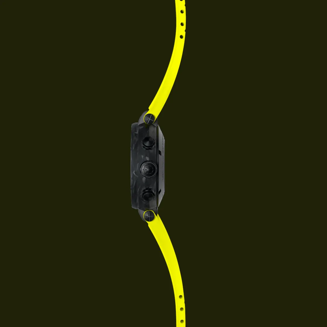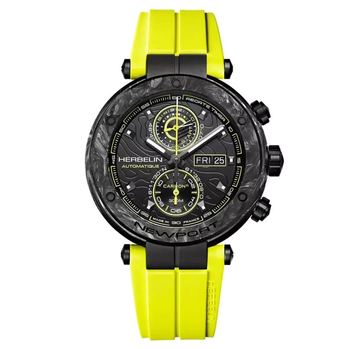 Montre de la collection Newport, Edition limitée, mouvement suisse automatique 3 aiguilles, dateur jour et date à 3 h, boitier en carbone titane sur bracelet silicone Jaune avec boucle déployante.