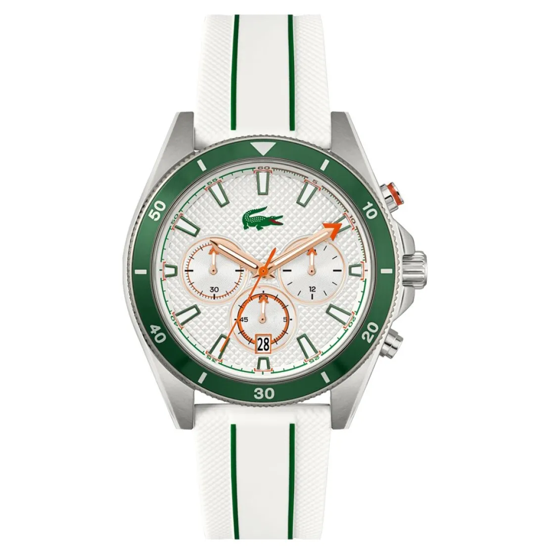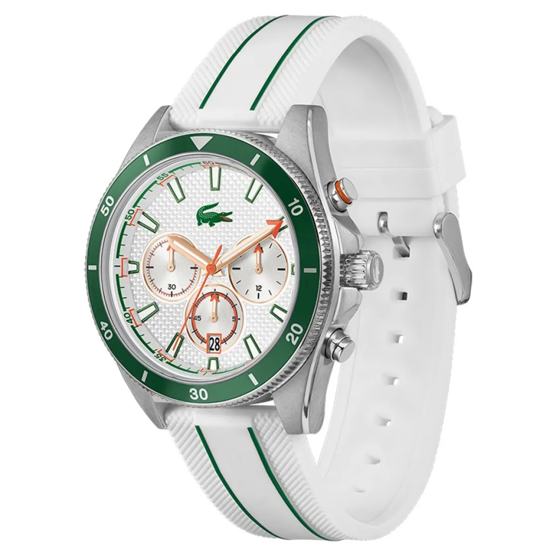Montre de la collection Mainsail, mouvement quartz chronographe, dateur à 6h, cadran blanc, boitier acier sur bracelet silicone blanc et vert.