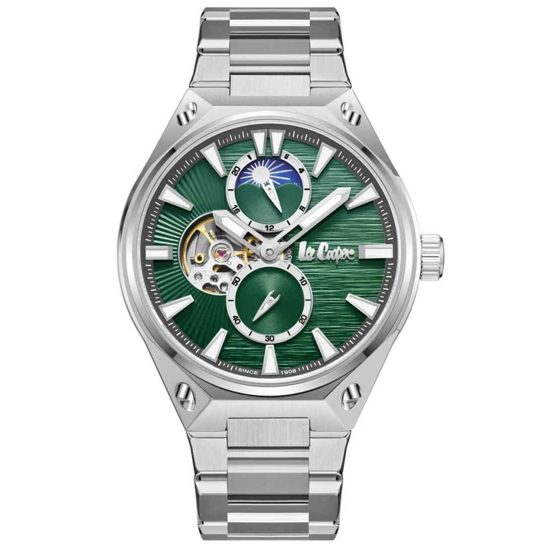 Montre de la collection Cameron, mouvement automatique multifonctions, cadran vert, boitier métal sur bracelet métal avec boucle déployante.
