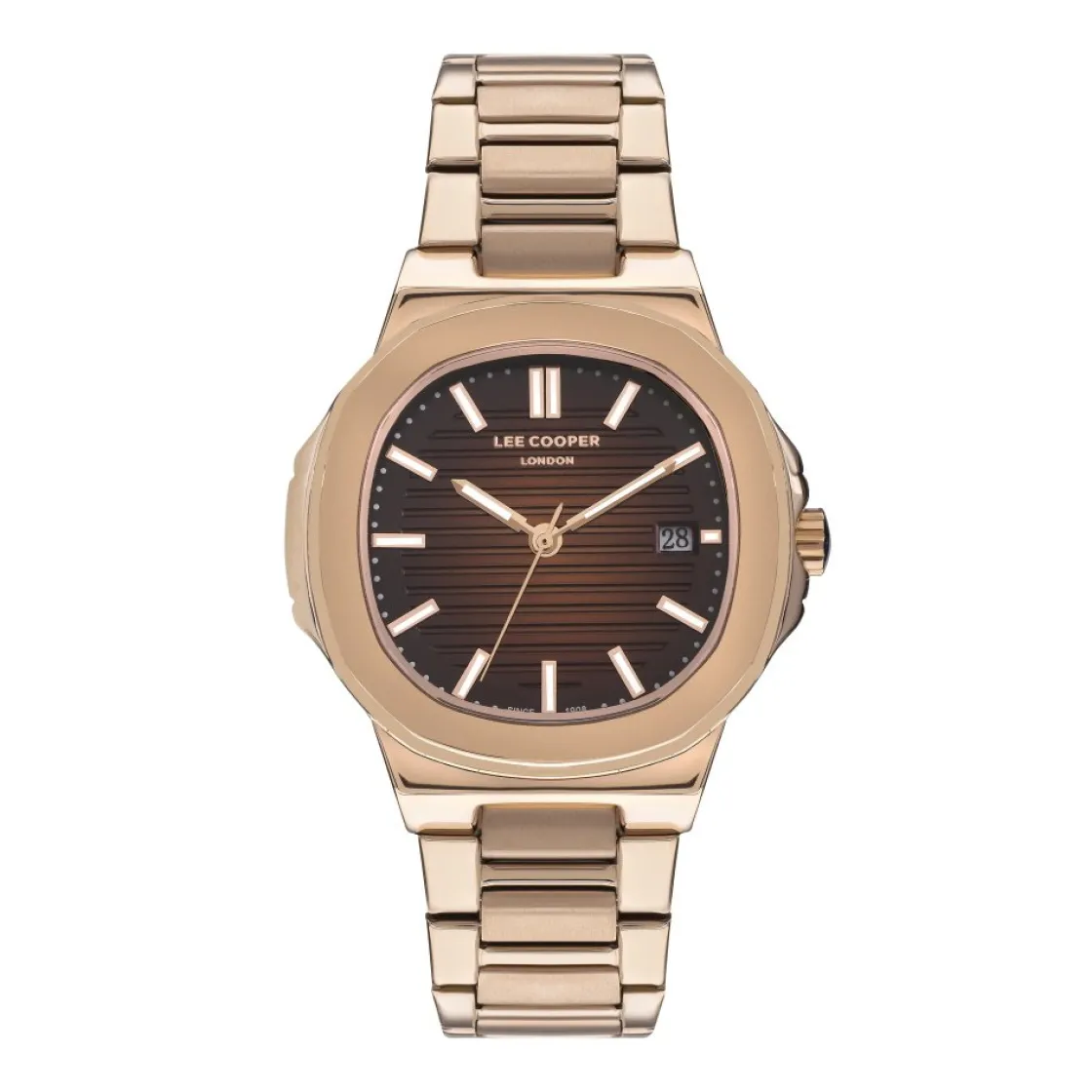 Montre Lee Cooper, mouvement quartz 3 aiguilles, dateur à 3h, cadran doré rosé, boitier métal doré rosé sur brace…