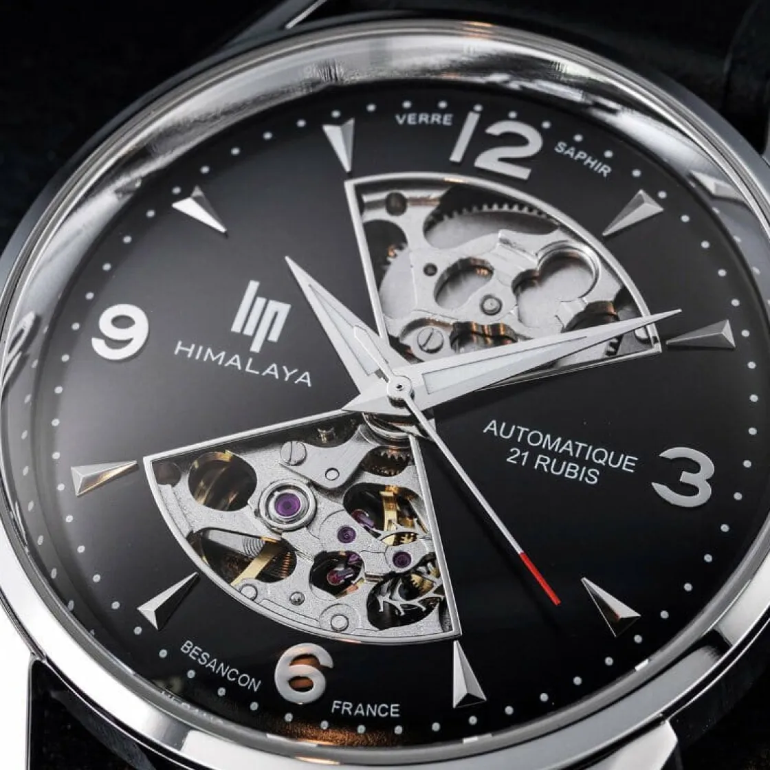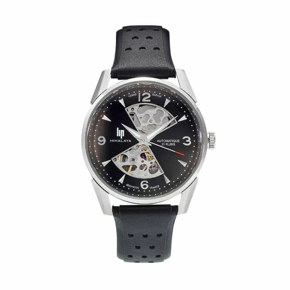 Montre de la collection Himalaya, mouvement automatique 3 aiguilles, cadran noir cœur ouvert, boitier acier sur bracelet cuir noir.