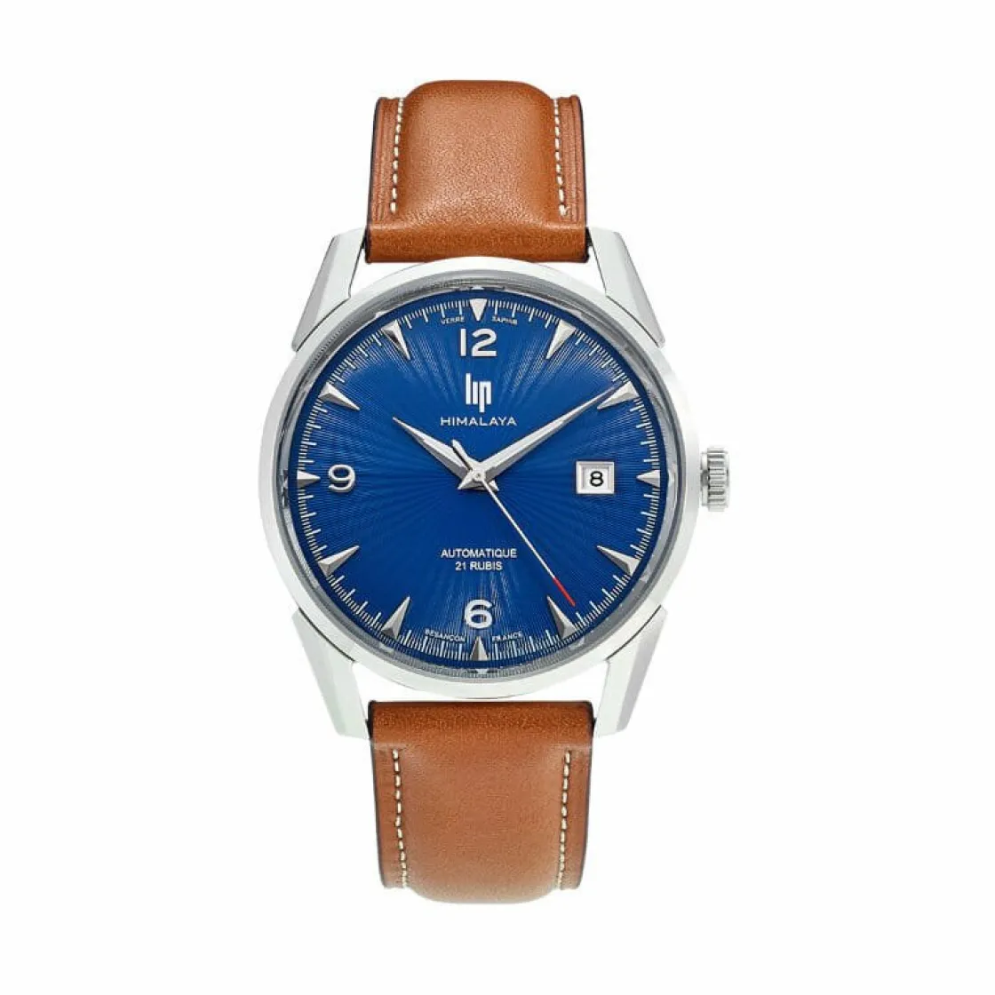 Montre de la collection Himalaya, mouvement automatique, dateur à 3h, cadran bleu, boitier acier sur bracelet cuir marron.