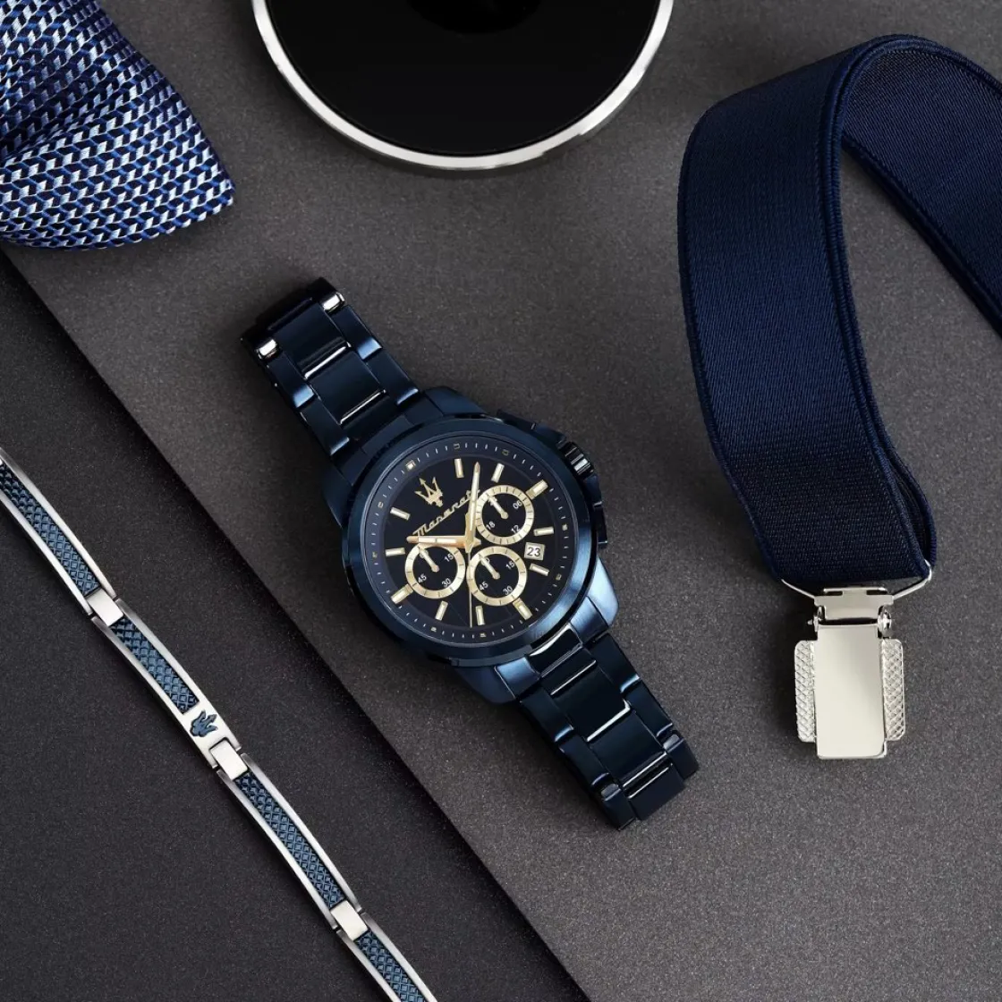 Montre de la collection Successo, mouvement quartz chronographe, dateur à 4h, cadran bleu, boitier acier bleu sur bracelet acier bleu, avec un bracelet bijoux acier.