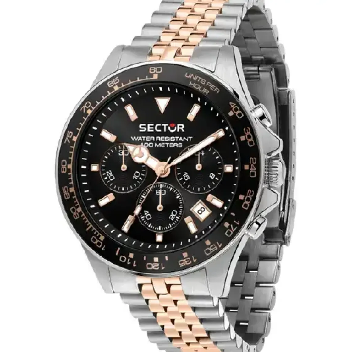 Montre de la collection 230, mouvement chronographe à quartz 3 aiguilles, dateur à 4 h, cadran noir, boitier en acier sur bracelet acier bicolore avec boucle déployante.