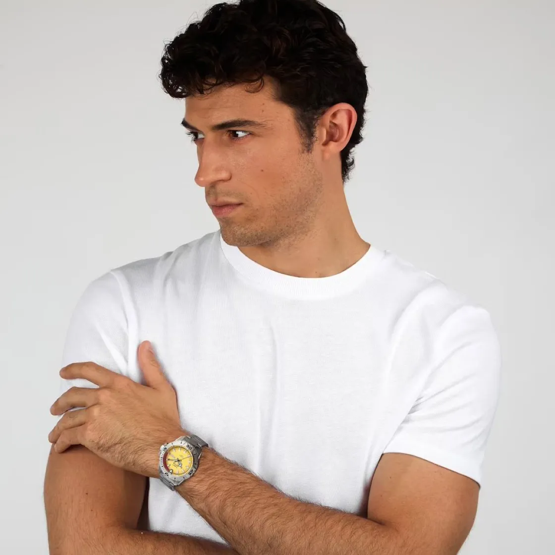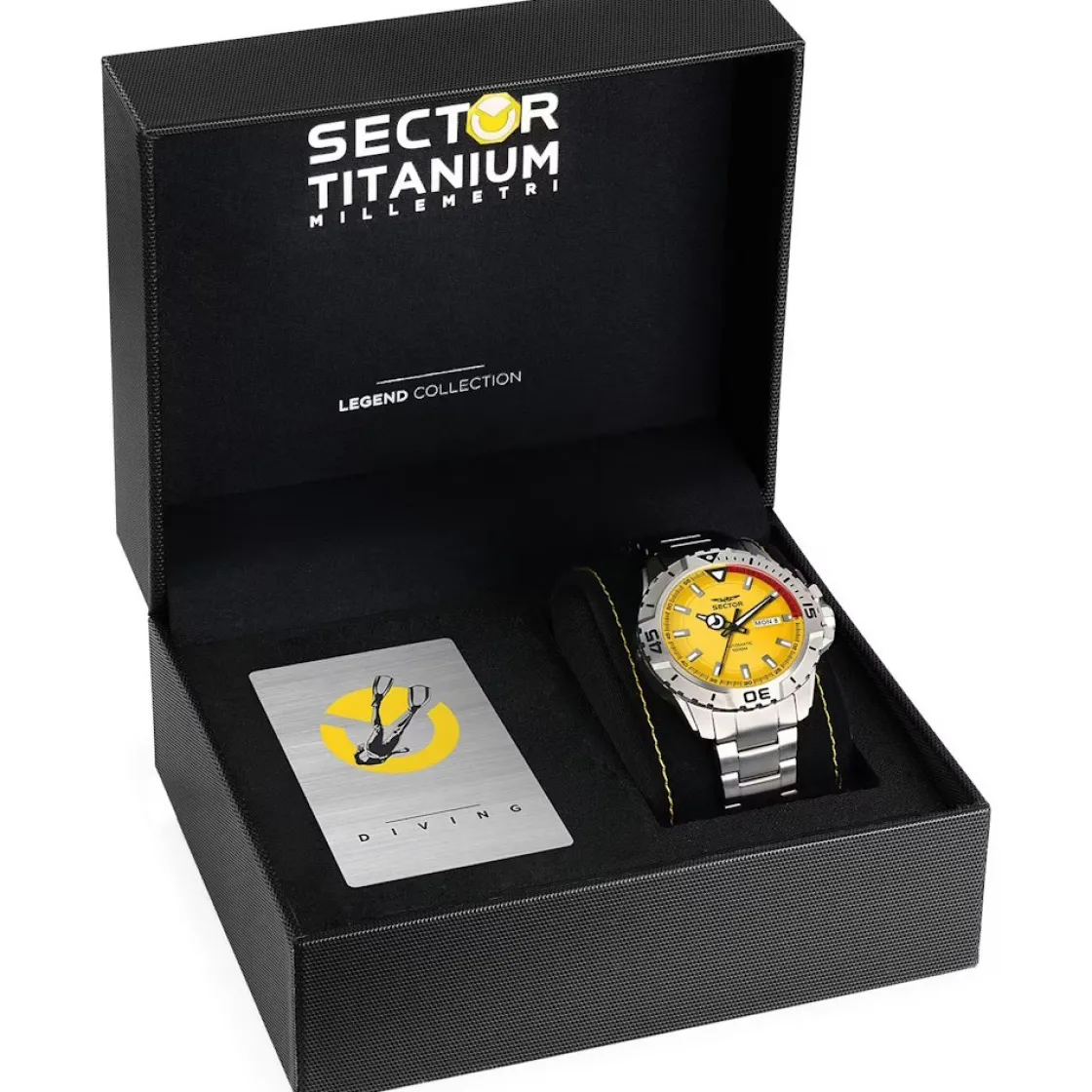 Montre de la collection Legend, mouvement automatique 3 aiguilles, dateur+jour à 3 h, cadran jaune, verre saphir , boitier titane sur bracelet titane avec boucle de plongée avec boutons, verrouillage de sécurité et extension.