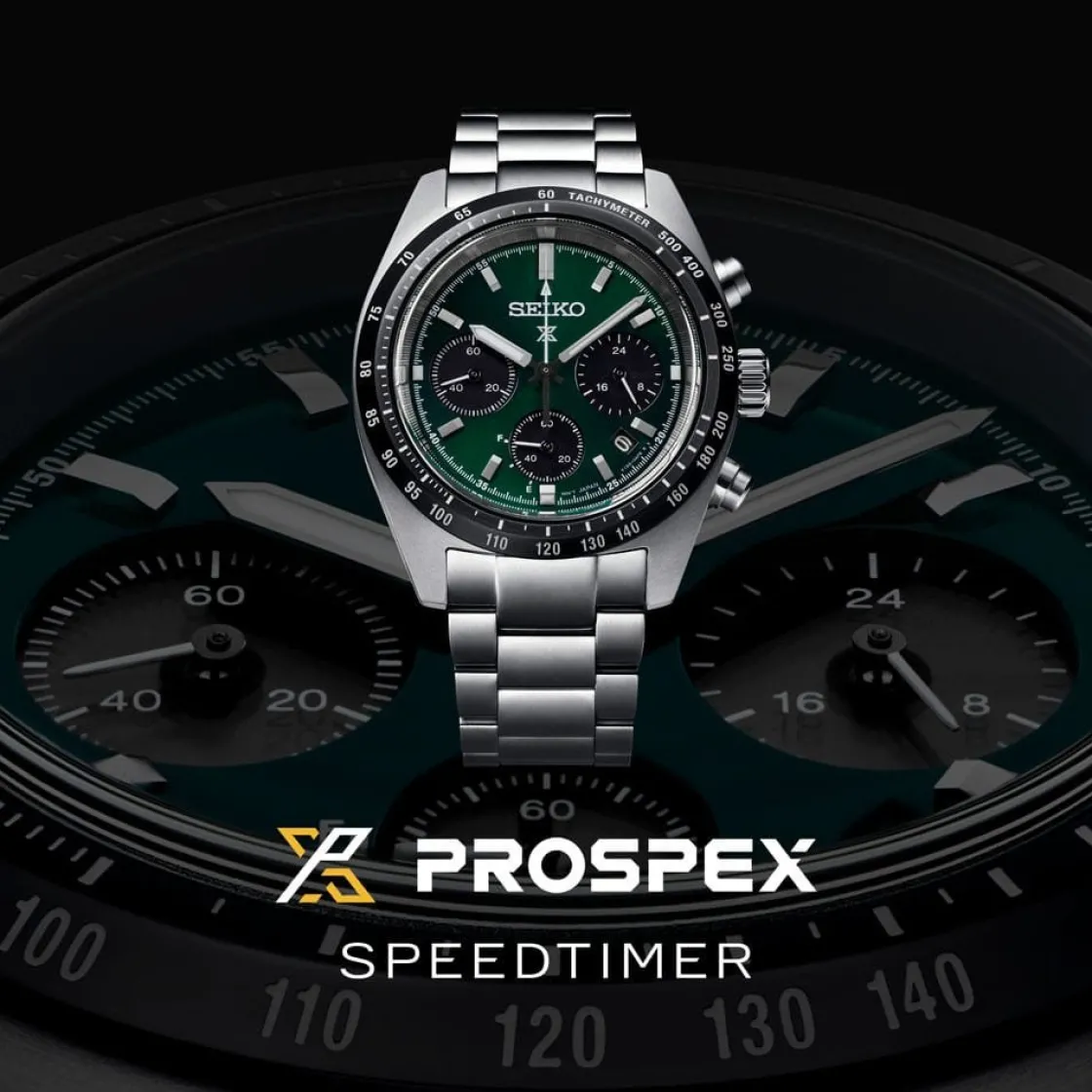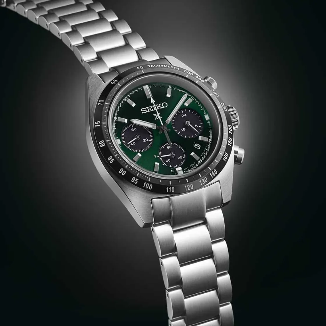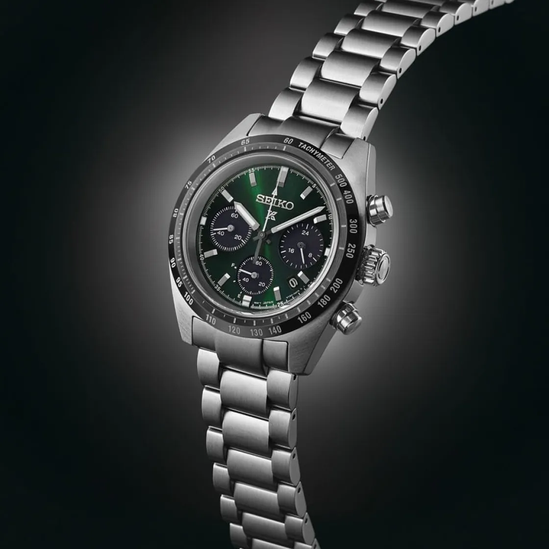 Montre de la collection Prospex, mouvement solaire chronographe 3 aiguilles, dateur 4 h, verre saphir, cadran vert, boitier acier sur bracelet acier avec boucle déployante.