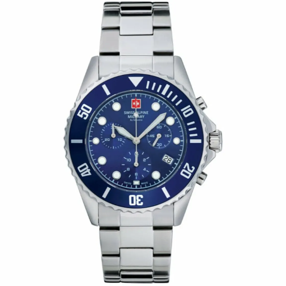 Montre de la collection Master Diver Chrono, mouvement suisse à quartz 3 aiguilles, dateur à 4h, chronographe, verre saphir, cadran bleu, boitier en acier sur bracelet en acier avec boucle déployante.