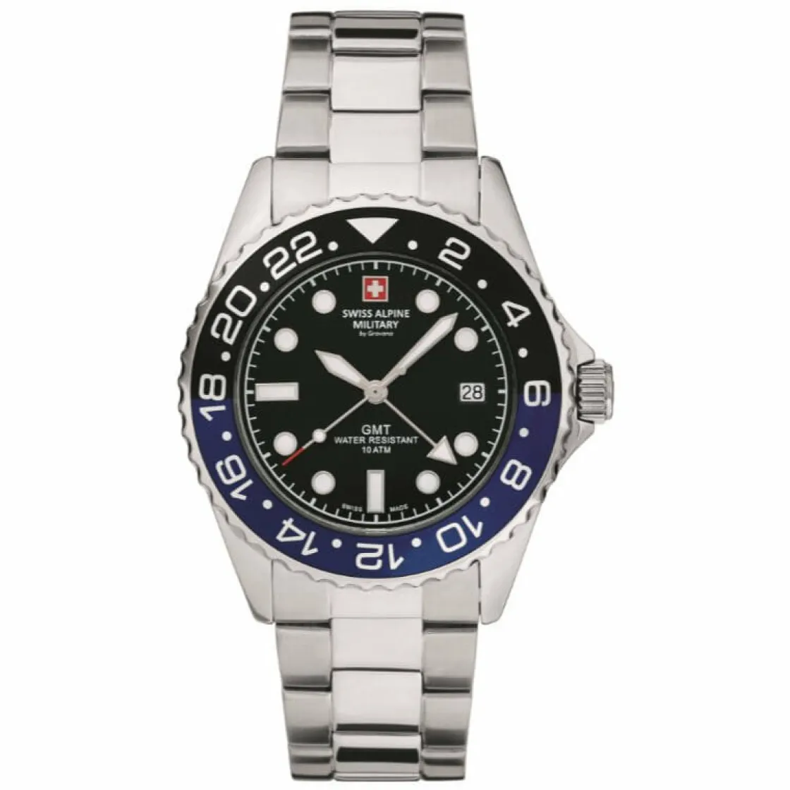 Montre de la collection Master Diver GMT, mouvement suisse à quartz 3 aiguilles, dateur à 3h, verre saphir, cadran noir, boitier en acier sur bracelet en acier avec boucle déployante.