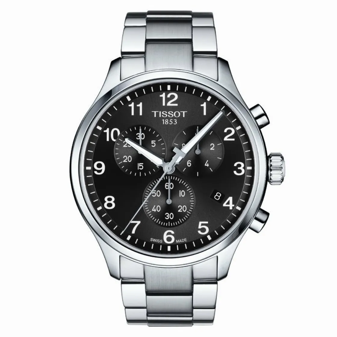 Montre de la collection Chrono XL Classic, mouvement suisse quartz chronographe, dateur à 4h, boitier acier, verre saphir inrayable, cadran noir, bracelet acier avec boucle déployante.