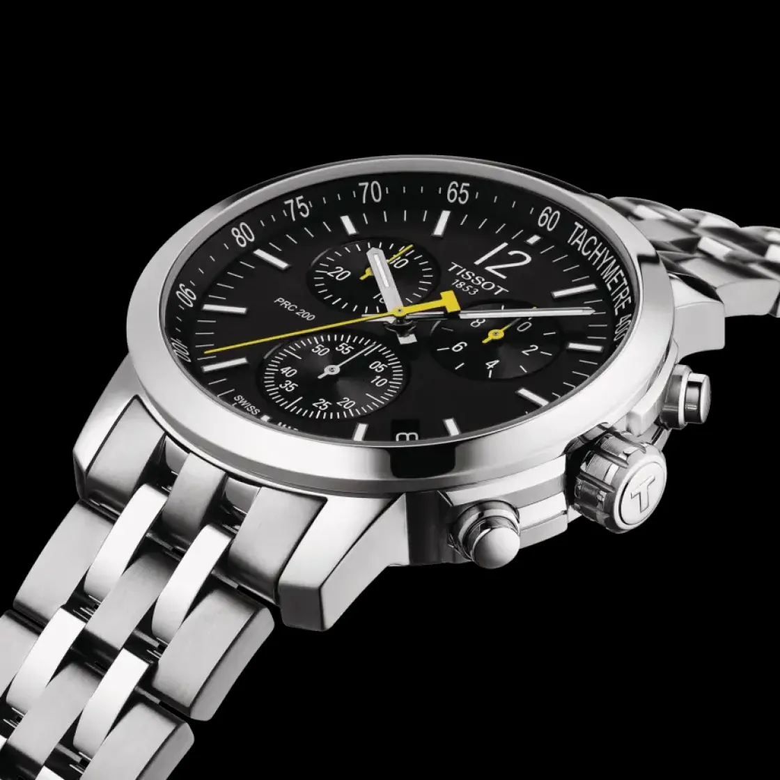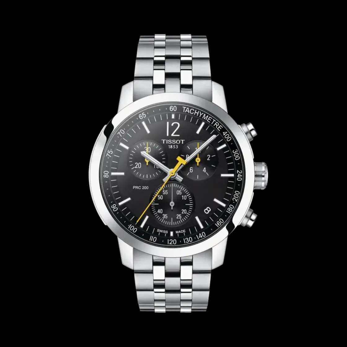 Montre de la collection PRC 200 Chronograph, mouvement suisse à quartz , verre saphir, cadran noir, boitier acier sur bracelet acier avec boucle déployante.