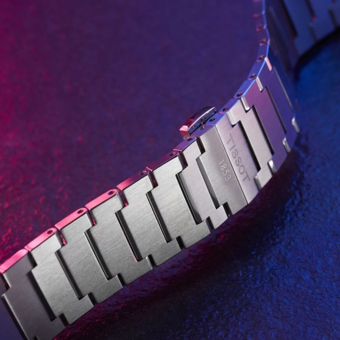 Montre de la collection PRX, mouvement suisse 3 aiguilles powermatic 80, dateur à 3h, verre saphir inrayable, cadran noir, boitier acier sur bracelet acier avec boucle déployante.