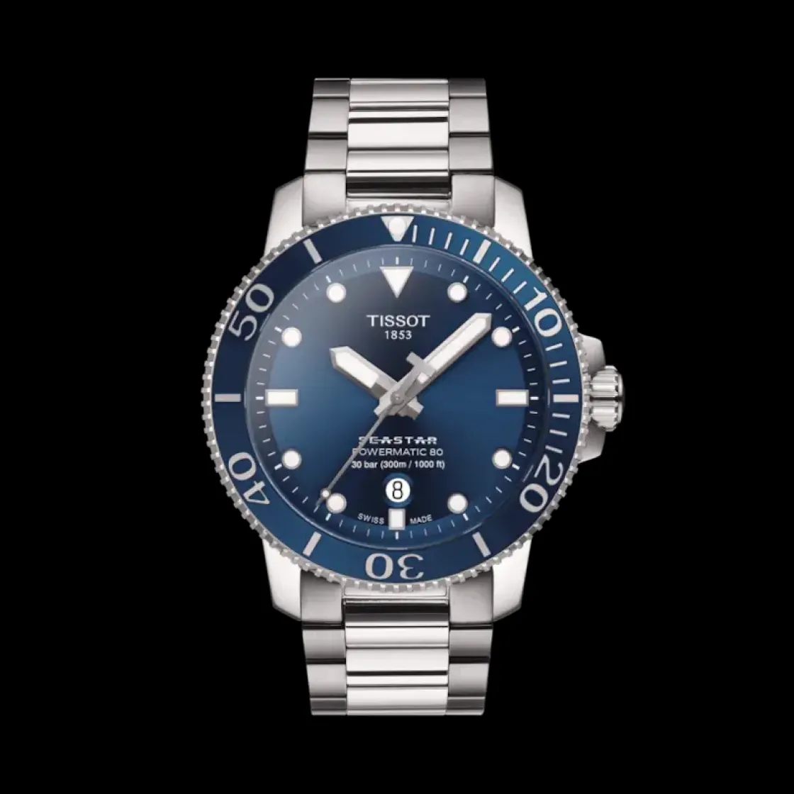 Montre de la collection Seastar Powermatic 80, mouvement suisse automatique 3 aiguilles, dateur à 6 h, verre saphir, cadran bleu, boitier en acier sur bracelet acier avec boucle déployante.