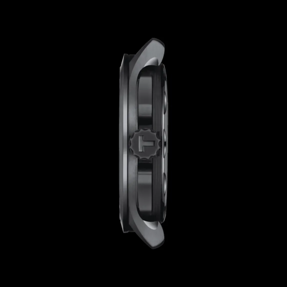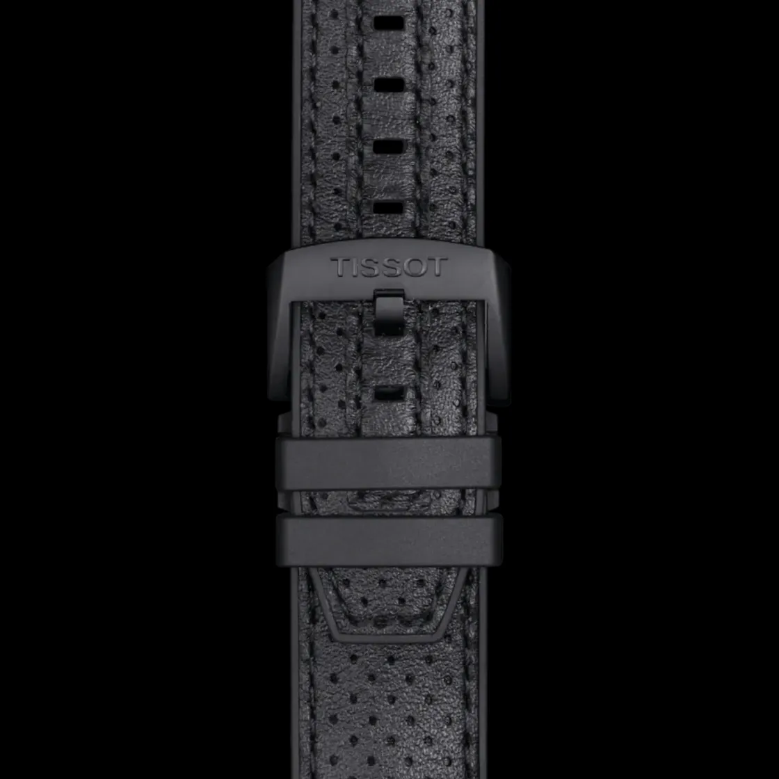Montre de la collection T-Race Cycling Tour de France, mouvement suisse à quartz 3 aiguilles, dateur à 4 h, cadran noir, boitier en acier noir sur bracelet cuir noir.